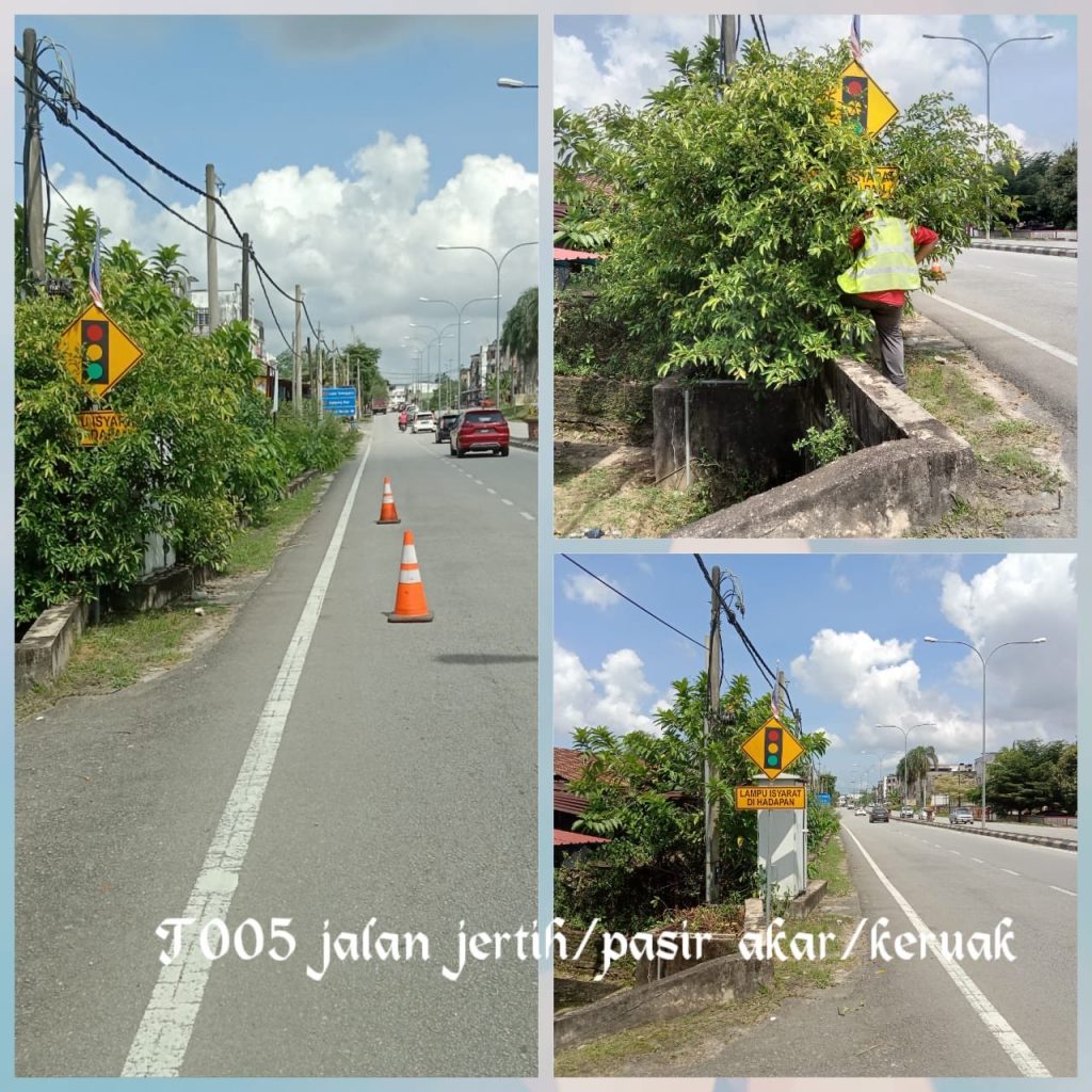 Kerja-kerja memotong dahan berjuntai yang menghalang papan tanda jalan. Daerah : Besut Jalan : T005 Jalan Jerteh / Keruak